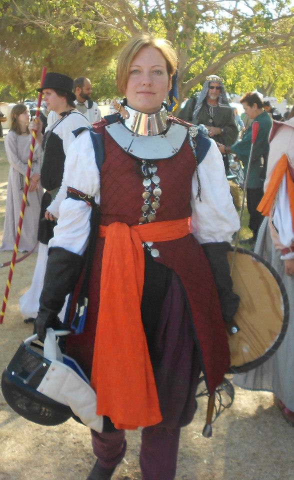 This weekend was chock full of those moments. I was running the rapier scenarios and I have to say I don’t think I did too bad of a job for running my first war battles. In fact, I think I’d like to do it again sometime. I learned a lot and had a lot of fun. Rapier scenarios (we play with late period three-musketeeresque steel blunted blades) are the most fun scenarios to create because you can make the rules as complicated or as simple as you want them to be. You can run the fights as a last man standing or give each fighter a number of ‘resurrections’ and make the scenarios objective based instead. Each kingdom has a number of warbands who always come out to fight together and I especially like the fighting at Great Western War because we typically have a wide variety of fighters from the West (Northern California), Artemesia (Utah area) and beyond. This is a picture of me in my rapier fighting garb, the thing around my neck is a gorget which protects my throat and collarbone from hard shots:
