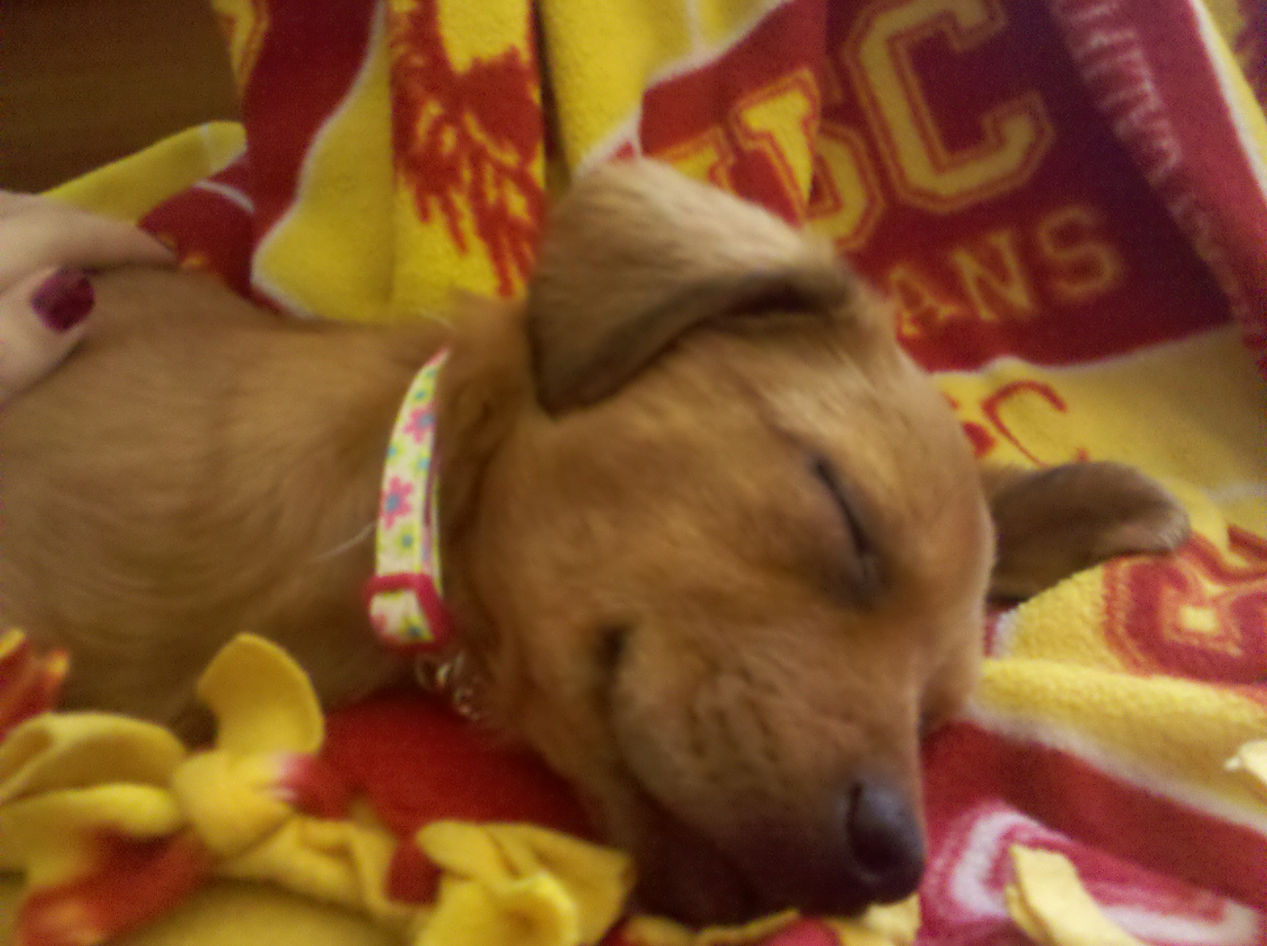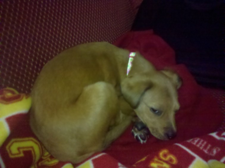 She wouldn’t sleep in her kennel, but has made her bed firmly at the foot of our bed on a pile of throw pillows (so that’s what those things are for!). She’s a huge USC fan (see the picture above) and, like most USC students, is a little too smart for her own good. She loves treats and can be bribed to do almost anything. She’s is learning to go on her AstroTurf square, which is a substitute until we get her her last round of shots and she can go outside. She loves anything that squeaks, crinkles, or crunches and my dad and brother warmed right up to her when they visited this weekend.