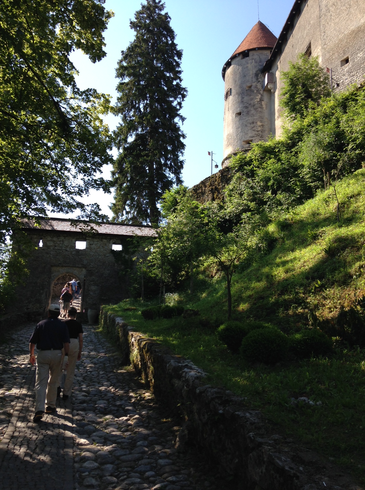 That evening I turned in pretty early, but in the morning we were up early and ready to begin exploring. Our first stop was to the grocery store around the corner to grab supplies for the day. I picked out some yogurt with Twix pieces mixed in for breakfast (Mo found some with Smarties) and we got bread rolls, cheese, salami and a packet of mayonnaise for lunch. Eastern Europe was so thoughtful to package their mayonnaise in small foil packets and tubes–they must have known how much Mo and I love mayo and what a waste it would be for us to buy a new jar in every city. Lunch fixings in hand we first headed up to the castle. Warned by Rick Steves that the inside of the castle was a little bit of a letdown, we decided to explore the outside instead. There was a great trail that led to beautiful panoramic views. My personal favorite aspect of the castle was the archery range at the base of the walls. I would have loved to shoot there, although I have a feeling most of my arrows would have gone soaring off into the lake below. For all you history/castle nerds out there (like me!) Bled castle was first referred to in 1011 (no one really know when it was first constructed) and is the oldest castle in Slovenia. The current castle is very Medieval/Renaissance, as were the re-enactors we saw trudging up the steep castle hill on their way to work. The placement of the castle on a towering cliff above the lake is breathtaking and looking back I’m very disappointed I didn’t get a better picture of it.