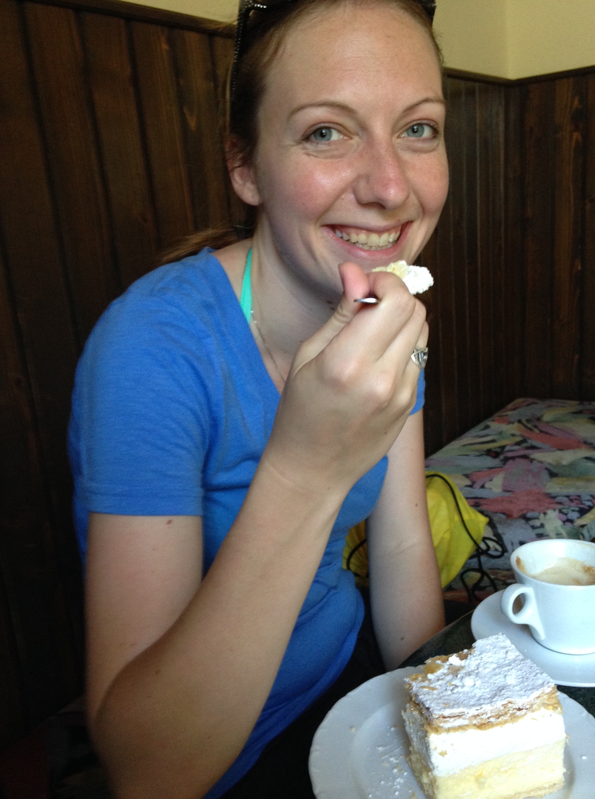 Back in town we decided we needed a little afternoon snack before tackling our next objective and stopped at a darling unpronounceable cafe called the Slačičarna Šimon to sample the other thing Bled is famous for besides a church in a lake– Kremna rezina, or cream cake. The cafe was adorable, with faded sports team photos on the wall, flowered tablecloths and classically outdated music playing. Slovenian cream cake consists of a layer of fluffy custard and a layer of whipped cream sandwiched between two layers of puff pastry and drenched with powered sugar. It is heavenly and I was very sad to learn that it was primarily a Bled delicacy– I would have eaten every day of the trip if I could have!