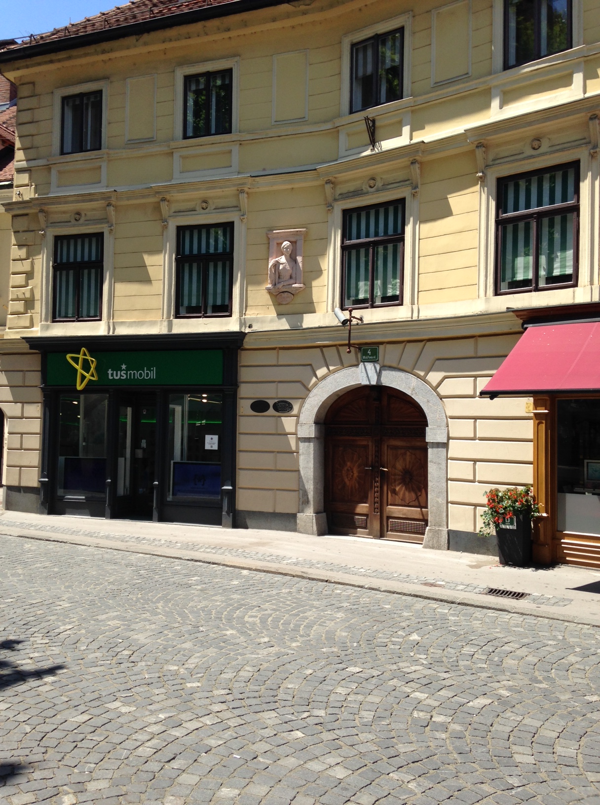 We checked into our hostel, but couldn’t go up to the room until 3pm, so we decided to drop our luggage off and explore the town a little first. Our first stop was Prešernov Trg, or Square, which is dominated by the huge pink Franciscan Church of the Annunciation and a statue of Franc Prešernov, Slovenia’s favorite poet. From a building across the square Prešernov’s lovely lady Julia makes eyes at the statue. Apparently the whole shebang did not go over well with the Franciscans, especially since there is a scantily-clad muse wrapped around the statue’s legs.